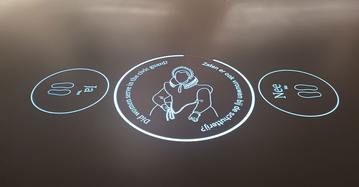In the gallery, a simple projection asks a multiple-choice quiz question, such as: Were women allowed to be members of the guild? Yes or No. The visitor can move to the circle where they think the answer is or just read it.