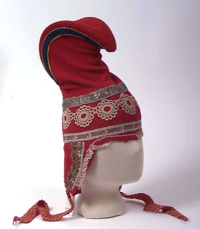This print shows three Sámi figures travelling through a snowy landscape. The figures each wear a red hat horn-shaped called ládjogahpir. These hats were used from around 1700 to 1900, but fell out of usage from around 1850 onwards as they were condemned by Christian groups for resembling devil horns.