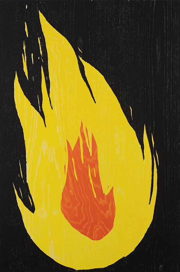 This woodcut print by Icelandic artist Rajnar Kjartansson initially seems simple, though more details around the woodgrain are revealed on a closer look. It is one of a series of seven large woodcuts focusing on flames - touching on the important symbolism of fire for Nordic art and cultures.