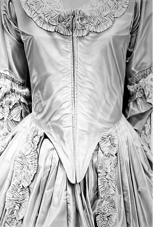 The level of detail in this charcoal artwork by Anna Zimmerman is staggering. At almost a metre and a half in height, it feels ultra-realistic with every fold and ruffle of the theatrical historical costume visible.